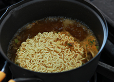 7) Boil the noodles with the remaining amount of water, vegetable flakes, and soup powder. Cook the noodles for 2 minutes and drain. -