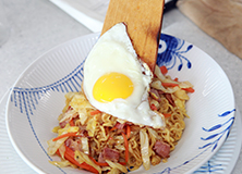 8) In an oiled pan, sauté in order the garlic, bacon, and cabbage. Add the noodles and sauce, and cook for another 2 ½ minutes. -